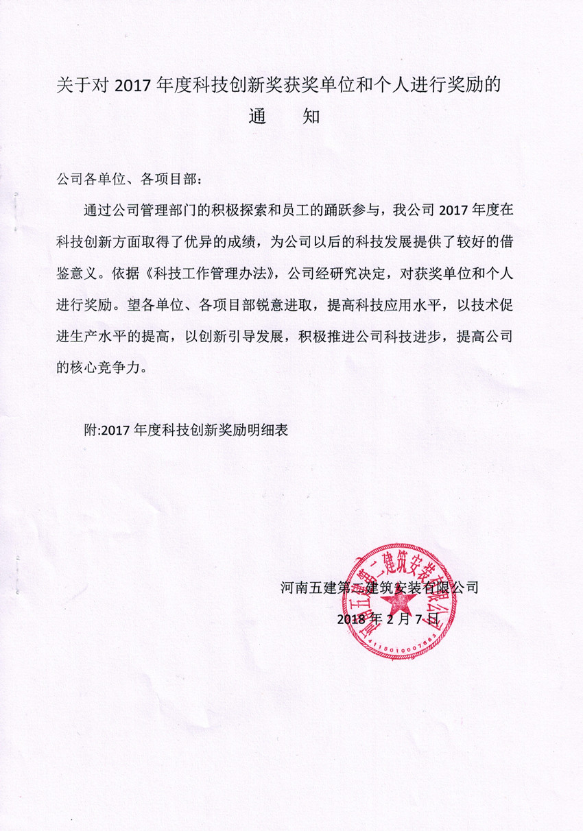 關(guān)于對2017年度科技創(chuàng)新獎獲獎單位和個人進(jìn)行獎勵的通知