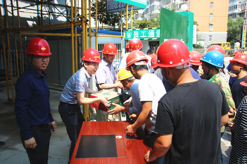 近期,連日高溫,驕陽(yáng)似火,為保證施工進(jìn)度,奮戰(zhàn)在一線的項(xiàng)目職工戰(zhàn)高溫、斗酷暑,在滾滾熱浪中保質(zhì)保量、高效地完成著施工生產(chǎn)任務(wù)。為做好防暑降溫工作,保障一線員工的健康權(quán)益,信陽(yáng)市住房和城鄉(xiāng)建設(shè)局副局長(zhǎng)陳弋明攜市城建監(jiān)察支隊(duì)隊(duì)長(zhǎng)蔡維全及城建監(jiān)察人員一行不畏酷暑,來(lái)到我公司湖東春天項(xiàng)目部,為奮戰(zhàn)在一線的廣大員工送去了絲絲涼意,還有端午佳節(jié)的親切問(wèn)候。