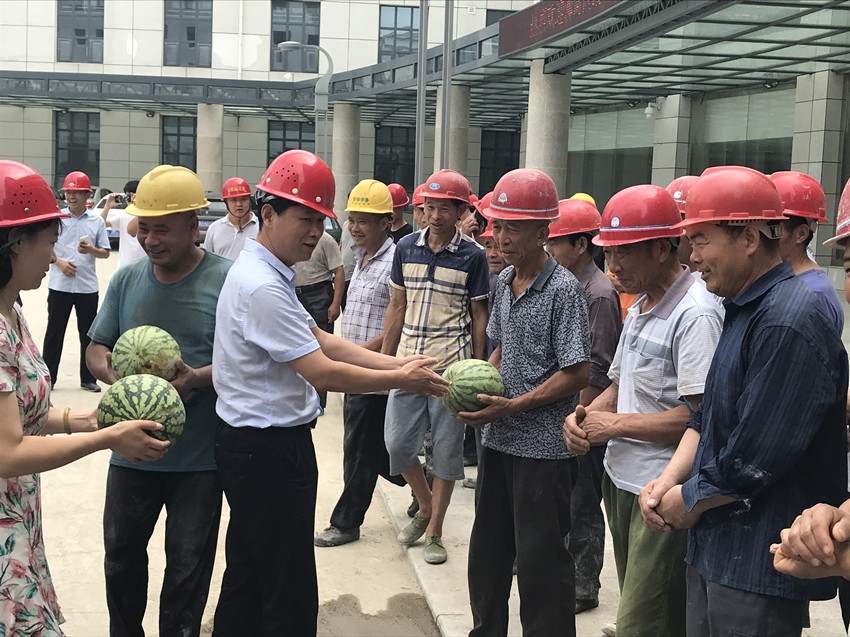 張國棟院長一行將礦泉水、西瓜等防暑降溫物品送到大家手中,叮囑大家在緊張施工中,一定要注意防暑降溫,注意施工安全,一句句真切的話語,表達出對一線職工深深的惦念。此次慰問活動給廣大戰(zhàn)斗在一線的工人們帶去了一絲清涼、一縷關(guān)懷,進一步營造了和諧穩(wěn)定的良好氛圍。
