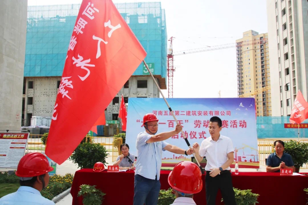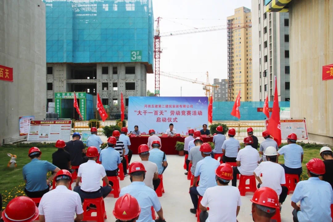 儀式開始后,吳部長首先宣讀了《河南五建二公司在建項目“大干一百天”勞動競賽實(shí)施方案》。此次競賽活動共有11個主體在建的項目部參加,公司對此次活動高度重視,成立了以吳萬仁董事長為主任的勞動競賽組委會,全面負(fù)責(zé)競賽工作的部署、督促、檢查及評比。此外,公司還對本次競賽活動的目標(biāo)、范圍、內(nèi)容以及競賽評價、總結(jié)表彰等工作進(jìn)行了詳細(xì)的策劃和安排。佳和熙岸項目部負(fù)責(zé)人蔡旺軍代表競賽項目部做了發(fā)言,呼吁所有競賽項目要為此次競賽活動取得圓滿成功而不懈努力。公司副總經(jīng)理吳建功對競賽活動提出具體的工作要求,他在講話中提到此次競賽活動的重要意義,要求所有參與者都要提高思想站位,高度重視,各競賽項目、機(jī)關(guān)各部門以及勞動競賽組委會要各專所長、密切配合,充分發(fā)揮創(chuàng)新引領(lǐng)作用,積極完成此次“大干一百天”勞動競賽活動。