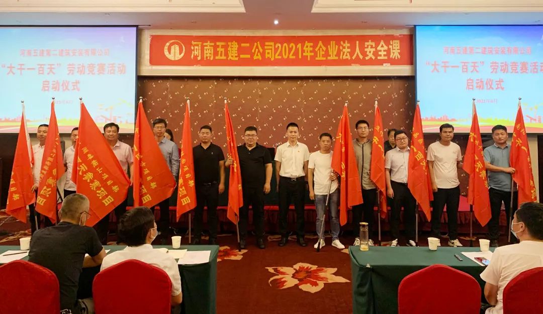 本次活動還包括公司2021年“大干一百天”勞動競賽的啟動儀式,公司副總工、工程部部長吳善艷宣讀了競賽活動方案,此次勞動競賽活動共有11個主體在建項目部參加,吳萬仁董事長親自為十一個參賽項目授旗并發(fā)表了動員講話,勉勵參賽項目“大干快上”,爭創(chuàng)佳績。