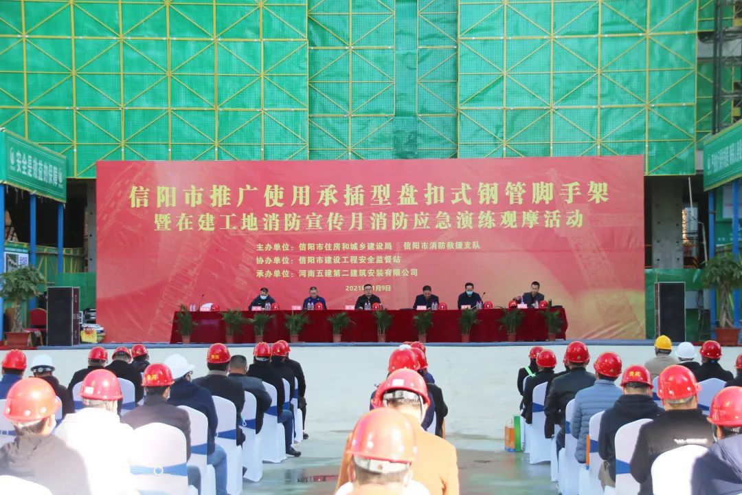 11月9日,在第三十個全國消防安全宣傳教育日來臨之際,公司第七項目部承建的太古·湖畔樾山項目迎來尊貴的客人,信陽市推廣使用承插型盤扣式鋼管腳手架現(xiàn)場觀摩會暨消防應急演練活動在項目現(xiàn)場隆重舉行。信陽市住建局黨組副書記、副局長張奔、安監(jiān)站站長馬其峰、副站長楊傳臣、信陽市消防救援支隊副隊長王偉等領導親臨活動現(xiàn)場,公司黨委書記、董事長吳萬仁受邀出席活動并講話。整場活動由會議階段、演練階段和觀摩階段三部分組成,由安監(jiān)站站長馬其峰負責主持。