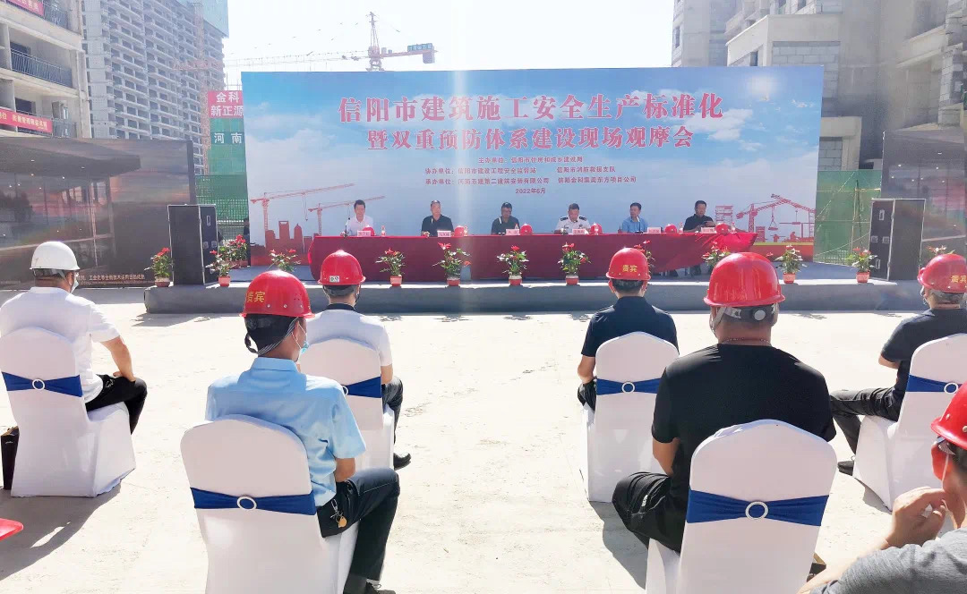 為深入開展全國第21個“安全生產(chǎn)月”活動,提高工程施工安全標準化水平,推進雙重預防體系建設工作,6月16日上午,信陽市建筑工程安全生產(chǎn)標準化暨雙重預防體系現(xiàn)場觀摩會在我公司金科集美東方項目現(xiàn)場隆重舉行。市住建局黨組成員、總規(guī)劃師張立、市消防救援支隊副支隊長王秀春、建管科科長陳志國、安監(jiān)站站長馬其峰及高新區(qū)住建局局長張彥偉等領導參加活動。公司黨委書記、董事長、總經(jīng)理吳萬仁受邀出席活動并講話。整場活動由會議階段、演練階段和觀摩階段三部分組成,由安監(jiān)站站長馬其峰負責主持。